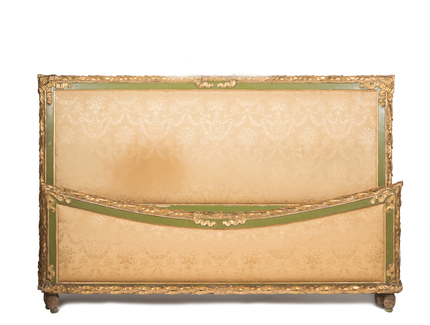 A very fine 19th century French gilded king size bed in original condition. The carved frame in the form of olive leaves and ribbons surrounding a painted frame bordering an upholstered panel, offering the opportunity to personalise the bed through custom fabric selection and restoration. Beds of this scale and craftsmanship are rare and were designed as focal points within a room. This antique French king size bed balances ornate detail with elegant restraint, making it suitable for a wide range of interior styles.