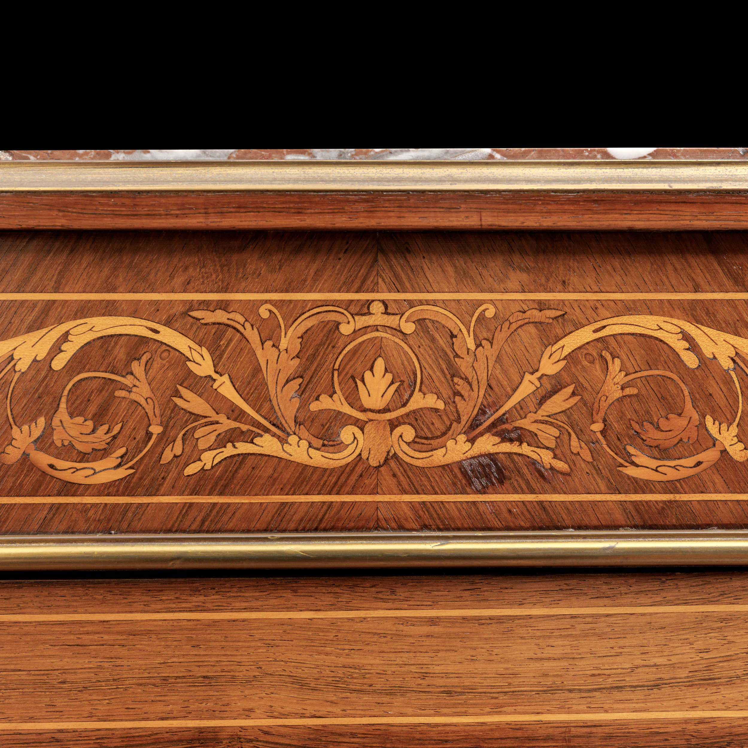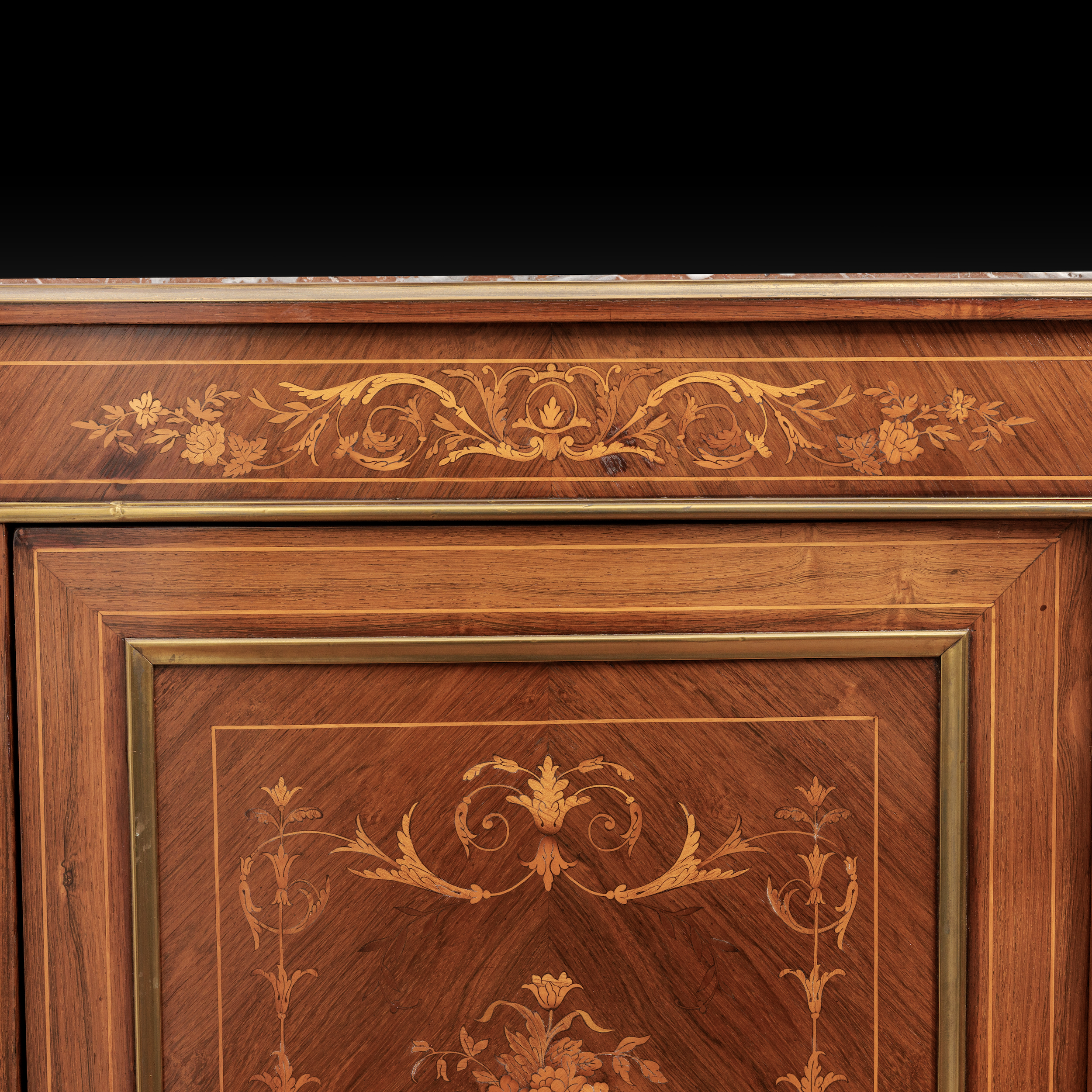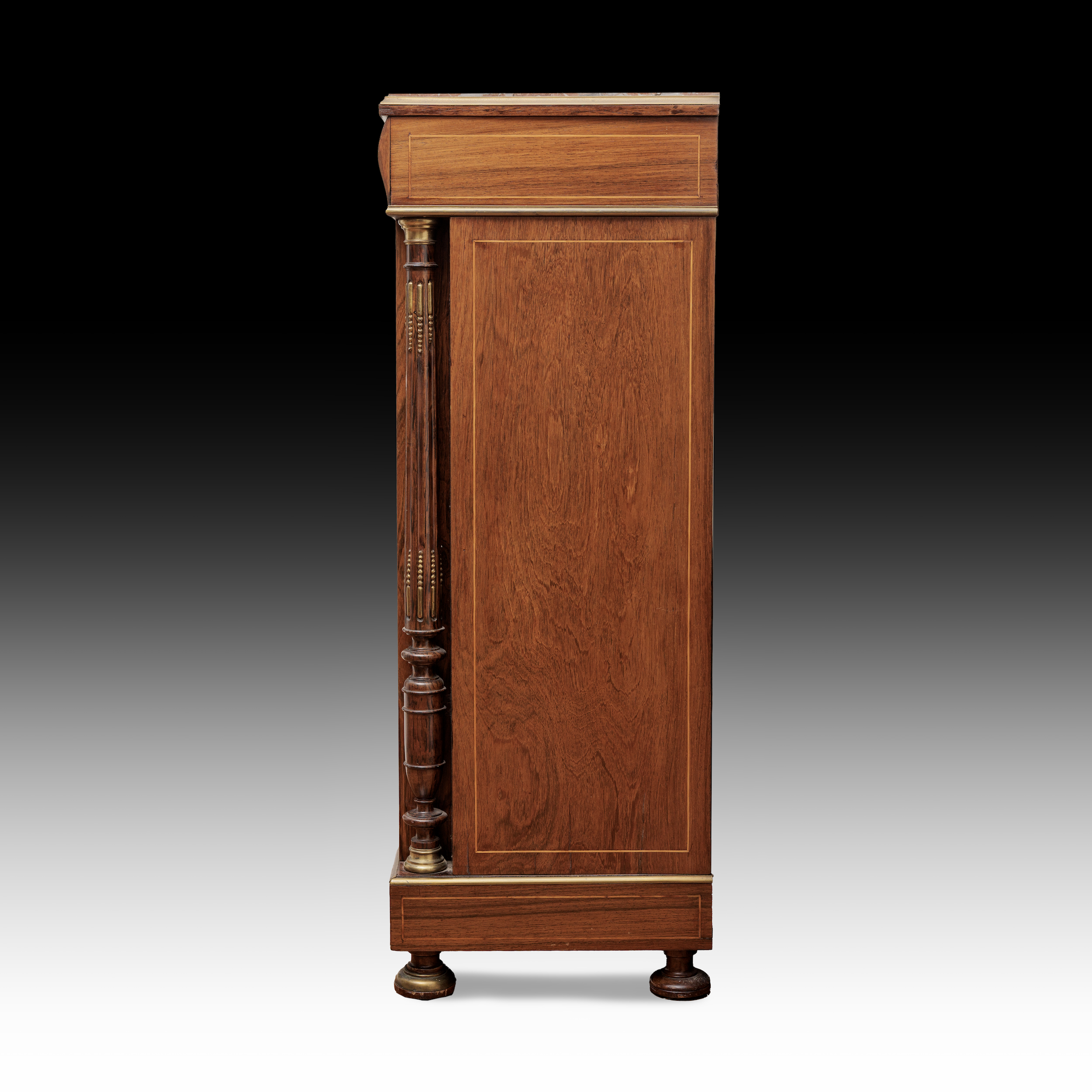Small Antique Cabinet: Small 19th century French marquetry pier cabinet, the marble top within a brass surround supported on a marquetry drawer above a rosewood door embellished with inlay in various exotic timbers in the form of a vase with flowers the door opens to reveal a cupboard flanked by a pair of fluted rosewood columns with ormolu amounts all raised on four bun feet with brass bandings.