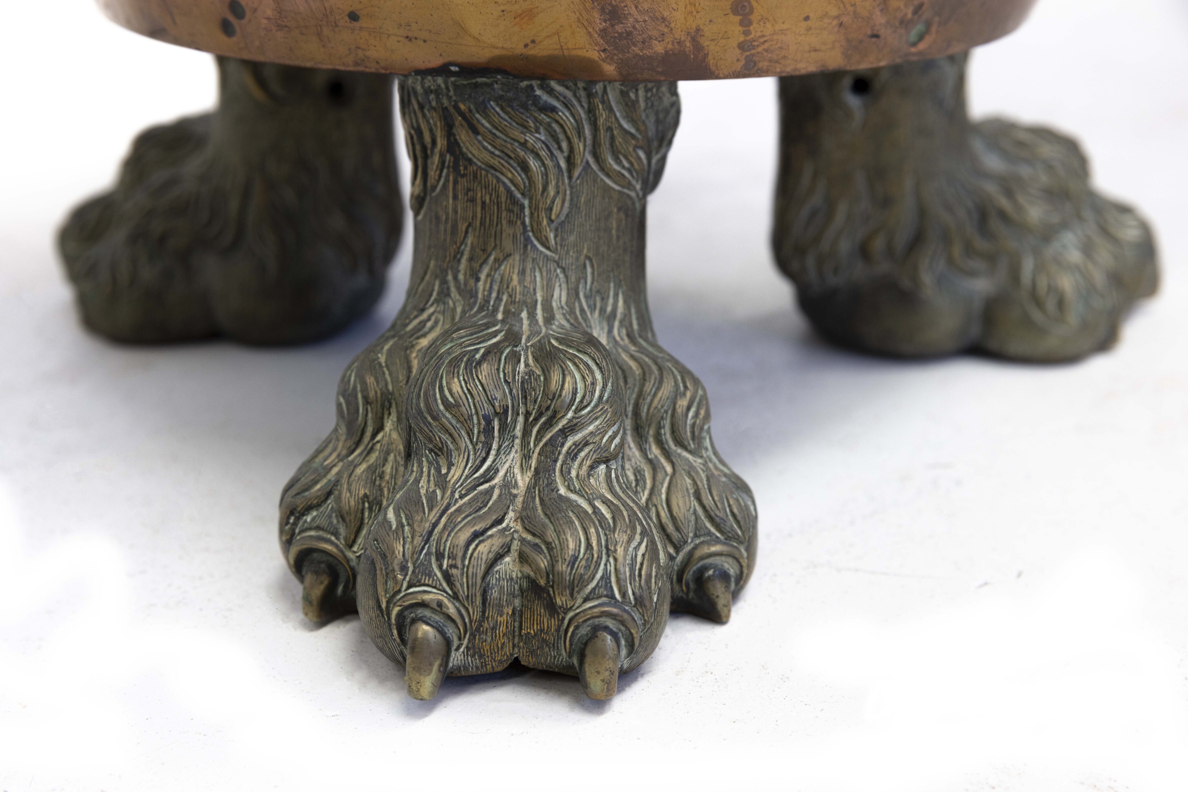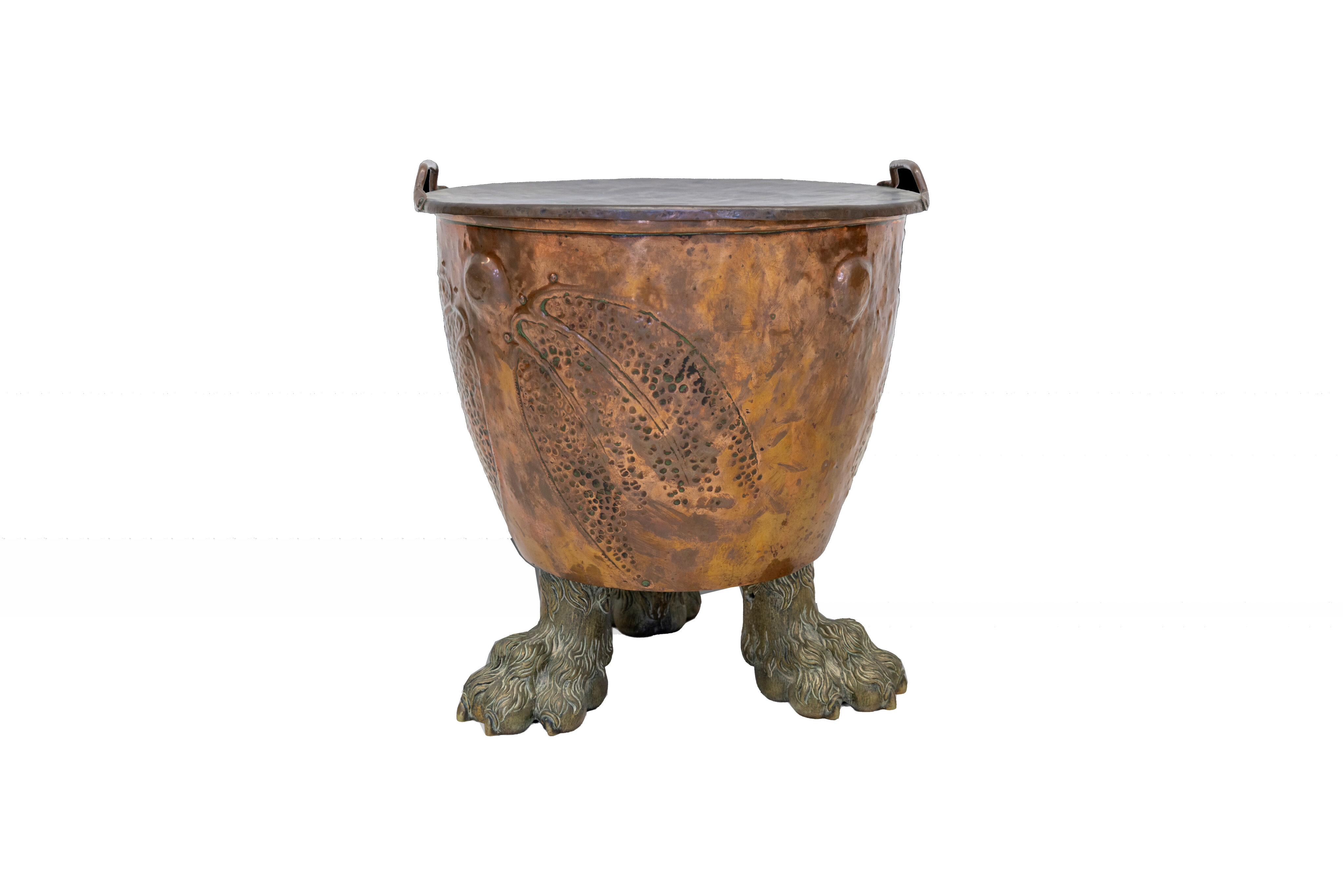 Antique Log Bin: Early 20th century French copper and bronze log bin, the copper top lifts to reveal a copper compartment for log storage supported on four bronze feet in the form of paws.