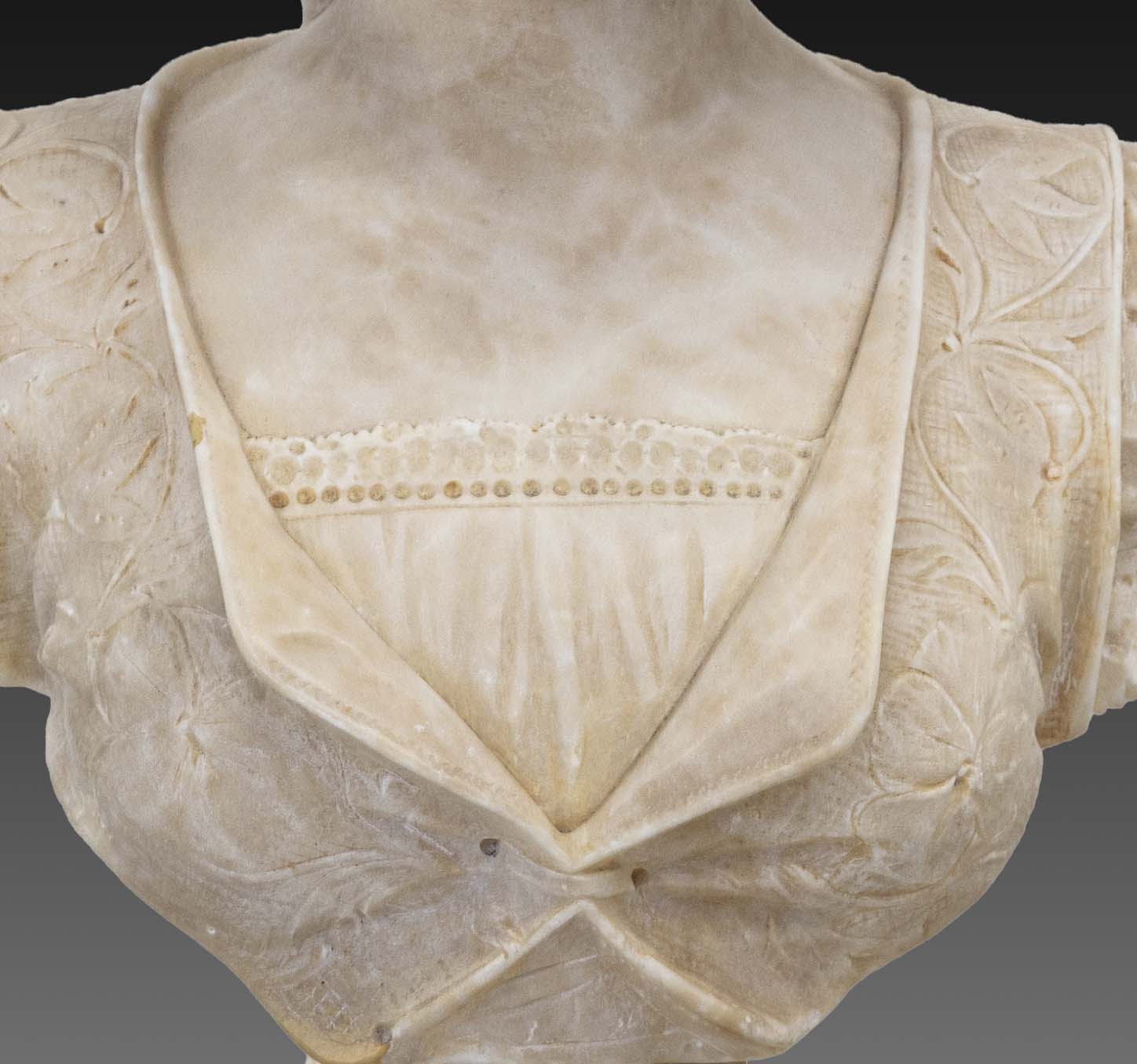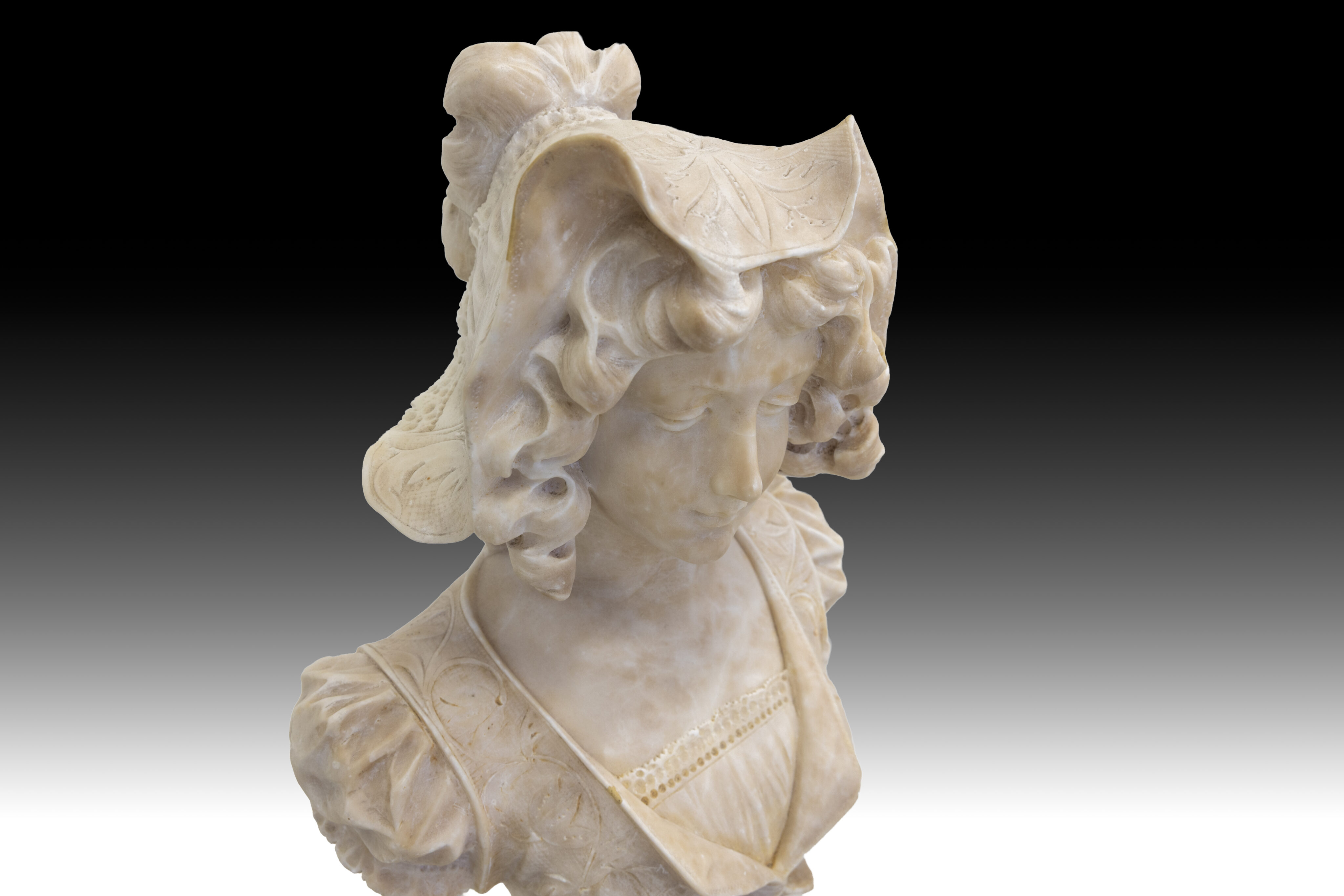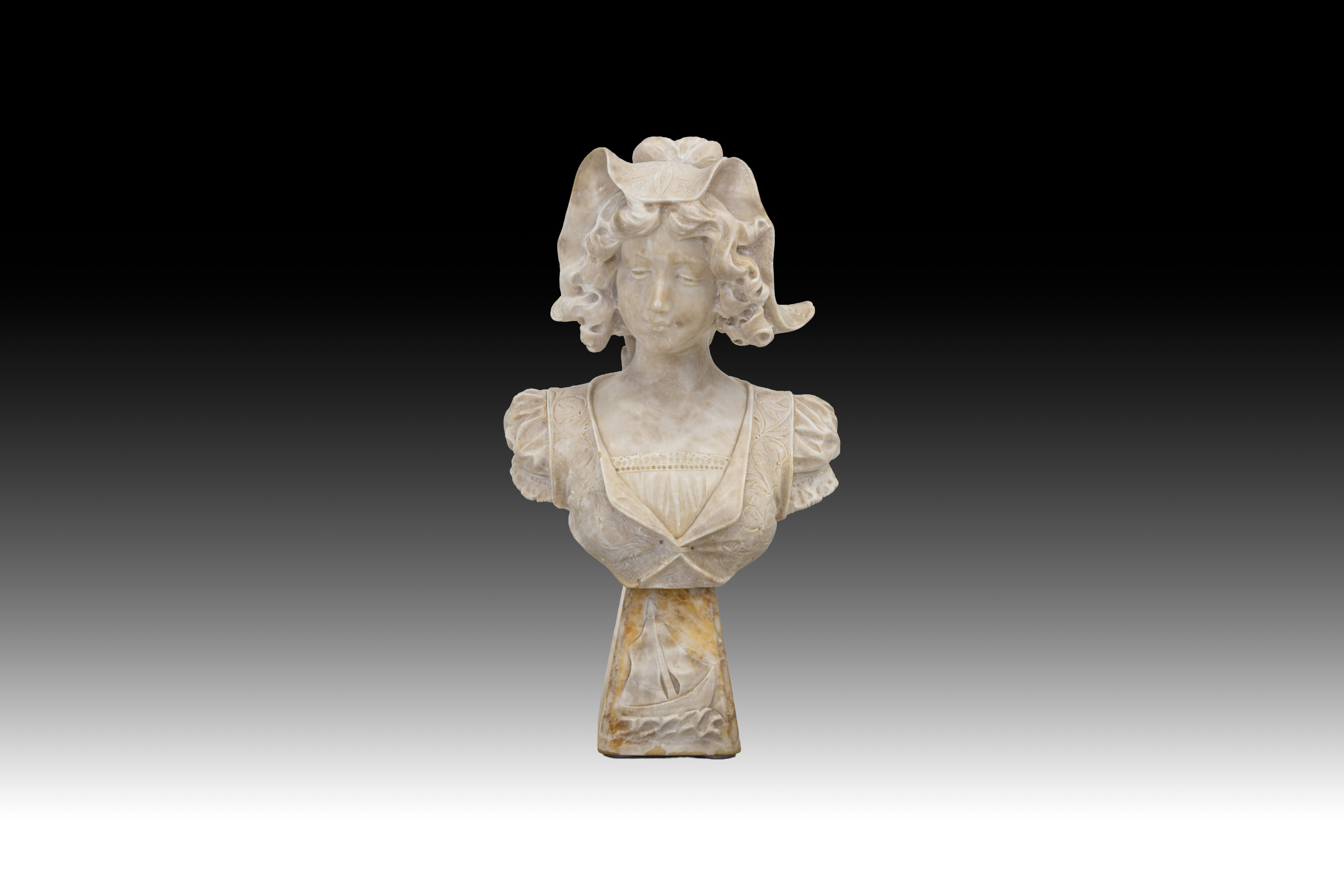 19th Century Alabaster Bust of Woman: Fine quality 19th century alabaster bust of a beautiful woman in a bonnet, the carved sailing boat on the plinth suggests a sailors wife waiting for her husband to return home from a voyage. The detail of the lace and floral pattern across the dress is particularly well done.