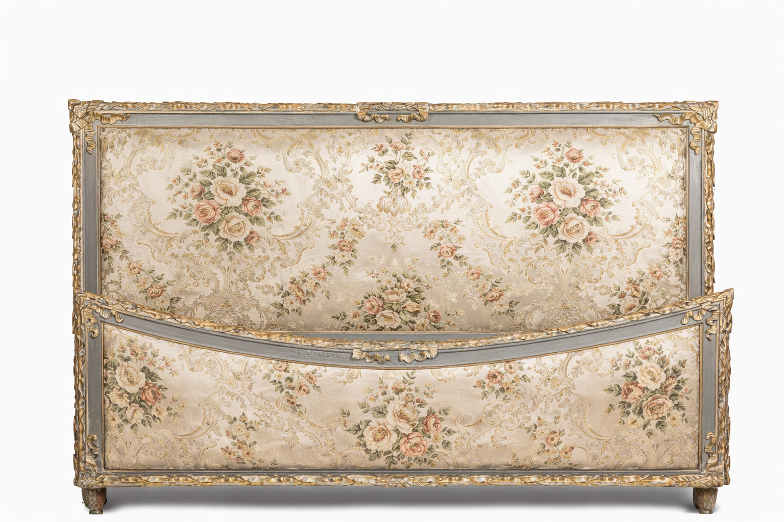 Note: The first five images here are conceptual only and illustrate a digitally reimagined example of how this bed could look were Wallrocks to restore and re-upholster it. The third image illustrates the bed in existing current condition. There are a myriad of beautiful quality fabrics and trims to choose from. Please contact us for a discussion on how this could be achieved.